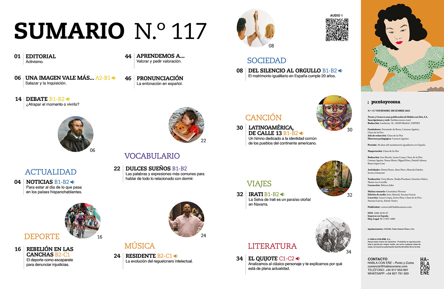 If your knowledge of the language is advanced, Puntoycoma is still for you: it presents the reader with a range of genuinely interesting, varied and up-to-date insights from Spanish-speaking countries. Travel, health, literature, society, history are all aired in items that are not linguistically watered down for a foreign audience. There are plenty of pointers to websites and to other reading where you can follow up on topics of interest. There is a page on contemporary language usage (slang?) and a section on grammar.